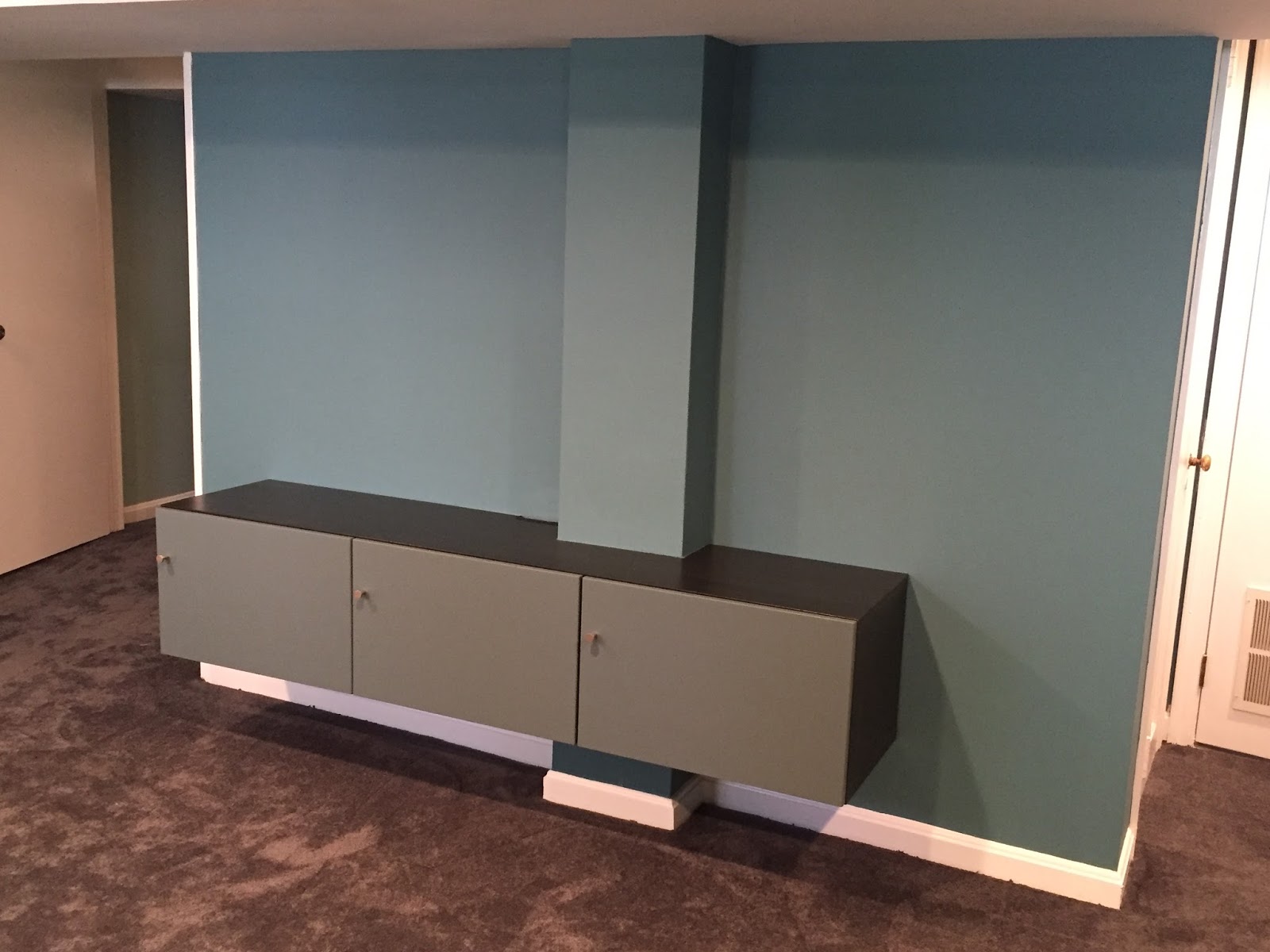 We picked a slightly lighter color for the office space. Part of the office has a tricky lower ceiling height, but the space is cohesive with the paint and an integral bookshelf that capably fills up an odd nook. The below pics show the office with the first coat of paint, but without the charcoal grey carpet that went in at the end of the project.